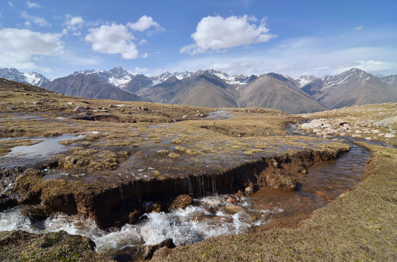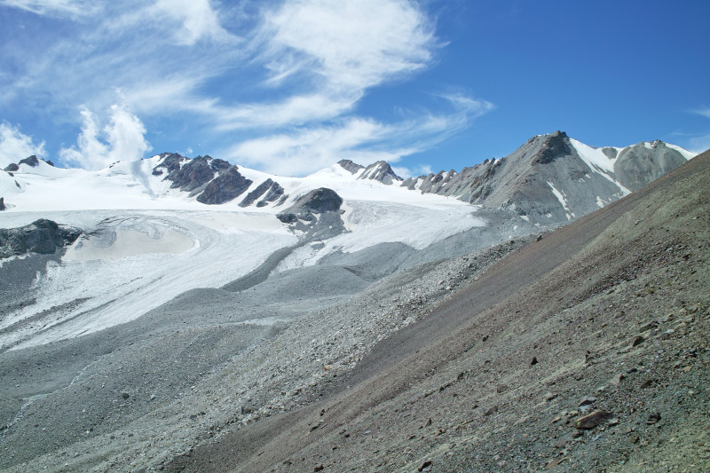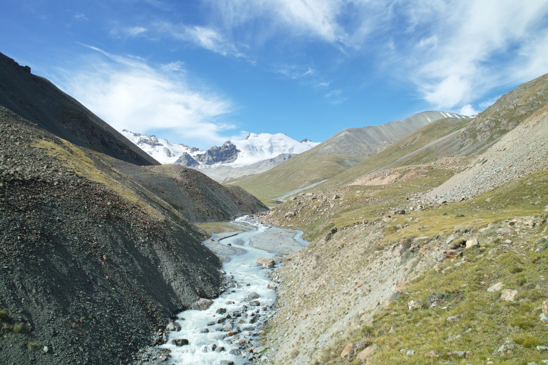 С утра солнце (ура!), завтракаем - и в путь! Сегодня нам предстояла довольно трудная радиалка - нужно было успеть сбегать до перевала (а это 11 км в один конец, с набором 1,3 км высоты), попытаться взойти на него и вернутся назад уже к двум часам дня (чтобы пообедать и успеть переехать в соседнее ущелье), поэтому встали пораньше и уже в семь вышли. Перейдя мост, прошли километра два до конца дороги, затем конными тропами до границы леса, и еще несколько километров по широкой заболоченной долине реки. Здесь уже нашему взору предстали панорамы заснеженных вершин и прочие красоты. Внизу, в пойменных лугах пасется скот, выше по склону тут и там с громким свистом носятся сурки. Набор высоты первые 8 км сравнительно небольшой (из 1300 метров, на них приходится всего 500), и поэтому прошли их часа за три.