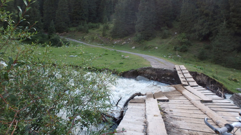 Незадолго до моста повстречали еще трех туристов, идущих пешком навстречу. Уже тот факт, что шли пешком, указывал на их забугорное происхождение, к тому же к этому времени стало окончательно понятно, что интуристы в этих краях - куда более привычное явление, чем гости из России. Парень из Канады и две девушки, из Франции и Германии. О как, полный интернационал (француженка к тому же была негритянкой)! Интересно все-таки, где они находят друг друга и организуются в группы, на каких форумах или на просторах каких соцсетей. К сожалению, расспросить об этом времени у нас не было, поскольку они, как и мы, поспешали. Все, что удалось выяснить - идут они без ночевки, одним днем, до альплагеря и обратно в Каракол. В общем, гуляют. Дал им совет попробовать переночевать в альплагере, благо, там все условия для этого имеются, и еще один день потратить на прогулку к озеру Ала-Кёль, ибо оно того стоит! Уж не знаю, прислушались ли они к нему в итоге (думаю, вряд ли), но по крайней мере, весьма заинтересовались таким вариантом (ну, или сделали вид, из вежливости - кто этих иностранцев разберет! )) )