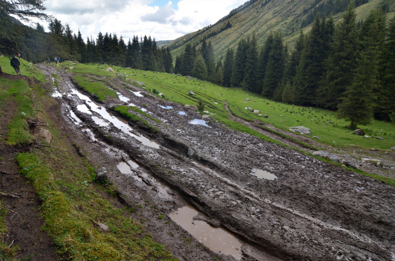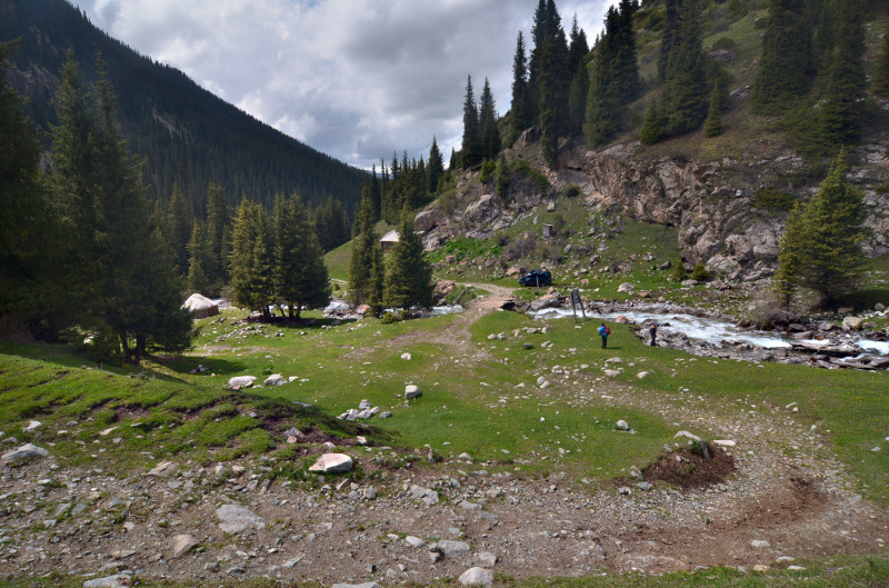 Несмотря на изрядную популярность у туристов ущелья Каракол, дорога, по которой мы поднимались, то и дело заставляла усомниться в ее проходимости для нашей полноприводной зверь-машины, даже с учетом полной высадки всех пассажиров перед наиболее каверзными участками. Похоже, у туристов по этой дороге принято ходить исключительно пешком. Но благодаря недюжинному опыту водителя, мы все-таки сумели достичь альплагеря еще до темноты (правда, встали на ночевку, немного его не доезжая, на просторных и хорошо утоптанных еловых стоянках, сразу после моста через речку).