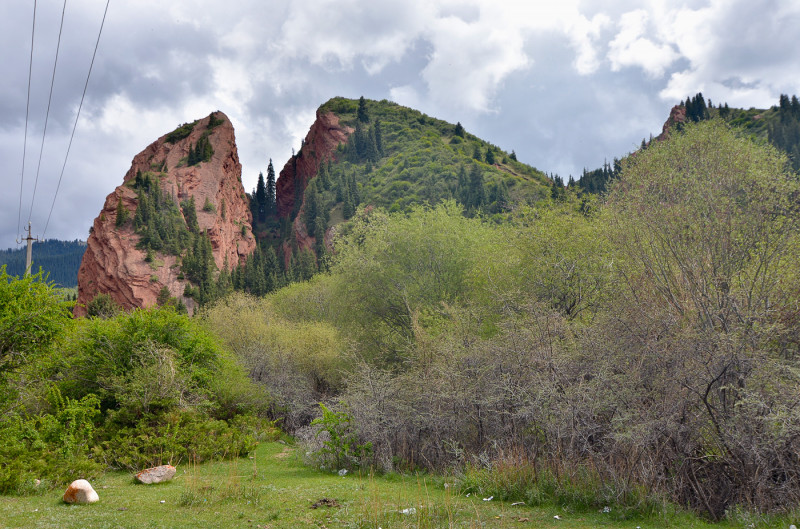 Ущелье это (в переводе c киргизского <<Семь быков>>) известно, прежде всего, характерной скалой из красного песчаника, расположенной на самом въезде. Причем, со стороны Иссык-Куля эта скала обильно поросла лесом и можжевельником и зовется у туристов <<Разбитое сердце>> за соответствующую форму, но если посмотреть на нее со стороны ущелья, то пред вами предстанут те самые семь красных быков (на самом деле сейчас их уже больше - процессы выветривания делают свое дело), давшие ущелью имя. Перед Разбитым сердцем Олег великодушно высадил нас для традиционной фотосессии. Жаль, что красиво снять эту скалу не получилось, ибо к нам она в это время суток была обращена теневой стороной, да и солнце было в тучах (а красный песчаник в тени сразу теряет все свое очарование и становится просто бесформенной серой массой), к тому же в кадр лезут строения и провода ЛЭП, идущей в ущелье вдоль дороги.