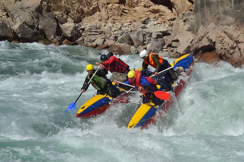 Четверка идет безымянный порог перед Кашка-Су, представляющий собой мощную горку с косыми валами и нехилыми бочками, а также заключительным навалом на кусок скалы в правой части русла, поэтому все экипажи при прохождении жались влево. В лоции Черника это описывается как "простая горка с несложным порогом", но мне это показалось не хуже самого Кашка-Су. Почему бы не дать название этому порогу, скажем, "Горка" с категорией трудности 5A или 5B