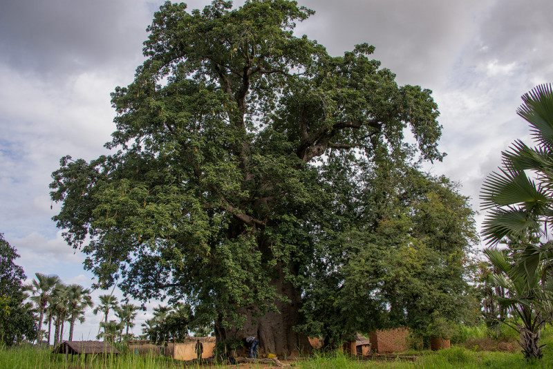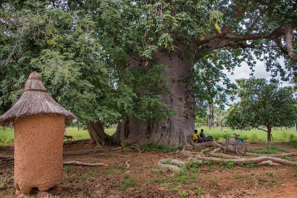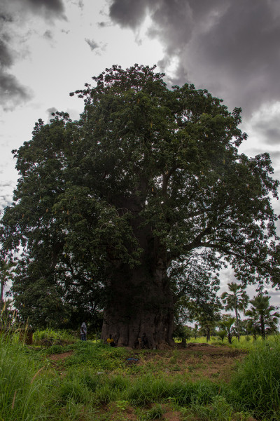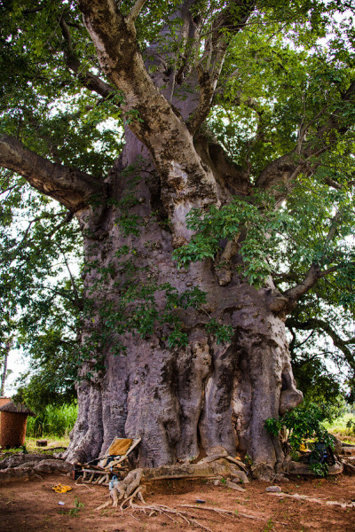 На обратном пути Идрисса завозит нас в какую-то придорожную деревню запосмотреть чудо-баобаб. Сразу говорю - без провожатых хрен найдешь. Баобаб велик, а в середине есть здоровенная полость, где без труда располагаемся мы втроем, местный "хранитель баобаба", Идрисса, и еще остается полно места. Ведет внутрь дерева малозаметная дырка у самых корней, в которую не без труда пролезет человек. В баобабе живет колония летучих мышей. Посещение обходится нам в 3000 сэфа (4 EUR)