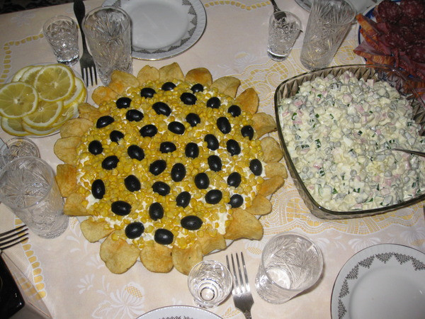 Так украсить можно фактически любой салат . Укладываем всё слоями (как это теперь стало модным), промазывая майонезом.