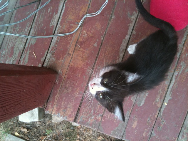 В подъезде сидит, орет, как не знамо че - открываешь дверь начинает мурррлыкать, хорошенький, чистенький - а главное, счастливый - трехцветный, мордочка необычного раскраса...