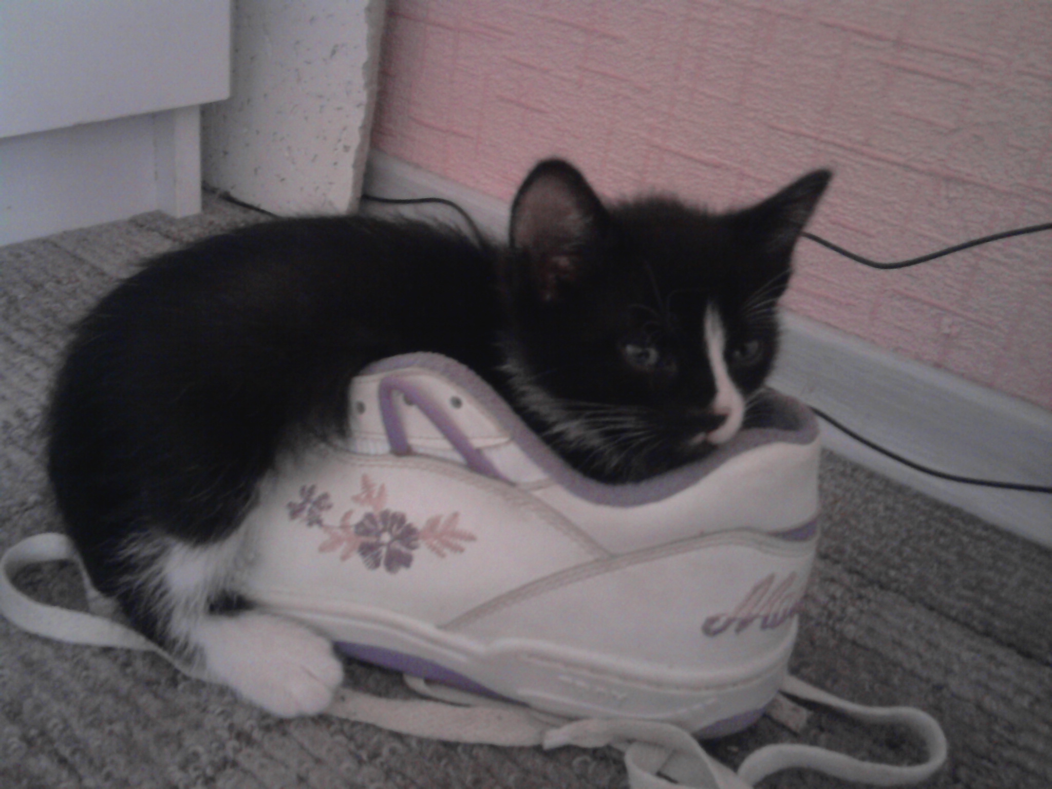 Вторая девочка – пока Шкода. Черная с белой манишкой и в носочках. Забавная. Ласкуша. Из коробки вылезла первая. Первая научилась залазить на пуфик и на стул. За ней потянулись остальные. Любит спать щека к щеке. :)