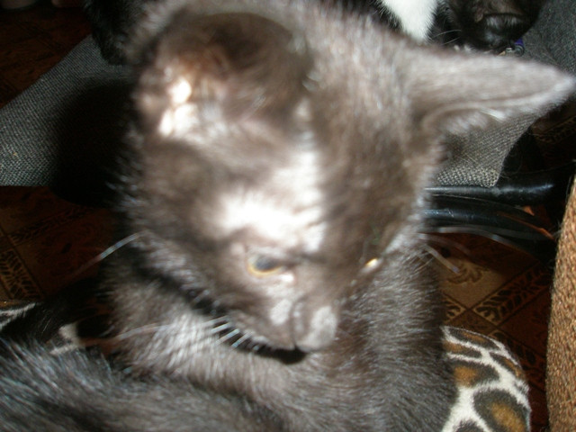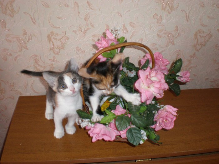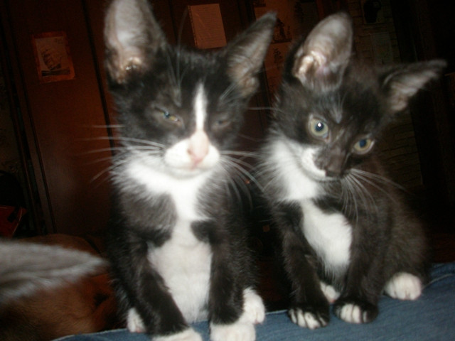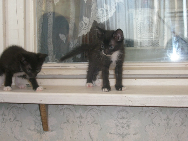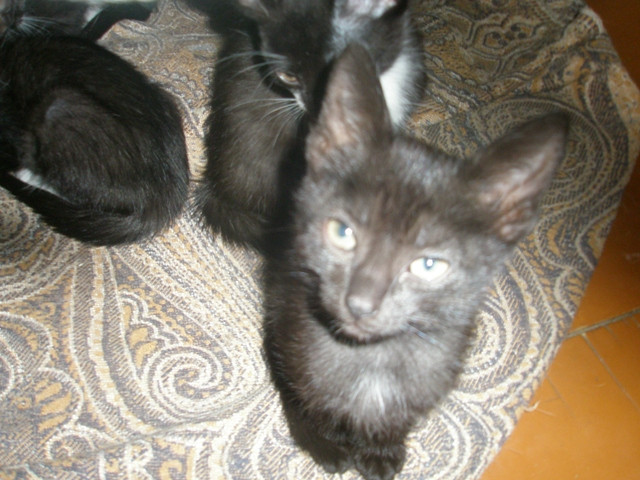 Рождены 28 июня. Абсолютно не избалованы. Все весёлые, игривые, здоровые. Мама-кошка без проблем ходит в кошачий туалет - в наполнитель. И в общем весьма воспитанная и ласковая. 1 девочка чёрненькая, похжа на маму - оооочень ласковая, любит сидеть на руках и мурлыкать, сразу видно что девочка, и 2 мальчика-хулигана. Один с симметричными белыми пятнышками, другой очень похожий - но ассиметричный. Оба обалдуя очень милые сумасшедшие ребята.