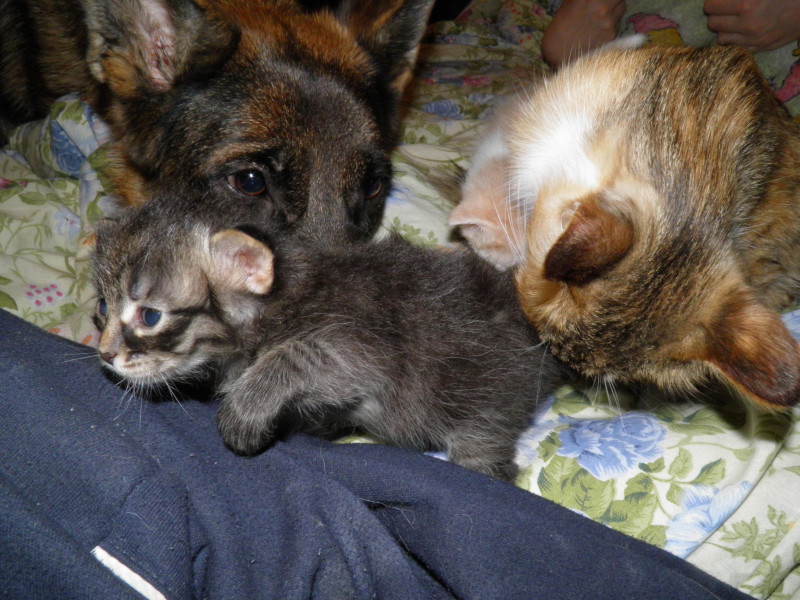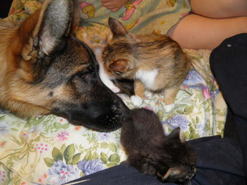 Уля - главная няня) караулит их, охраняет, вылизывает - только что не кормит))
