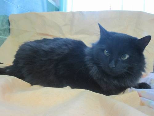 добрый вечер, у меня вот такая красавица, возраст 8мес, очень пушистая и ласковая! стереллизованая! очень надеюсь что она вам понравится и вы подарите ей дом, а то она уже очень давно на передержке((( глазки немного в кучу, но это ей не мешает, она похожа на совенка с такими глазками! очень красивая кошечка! полностью черная