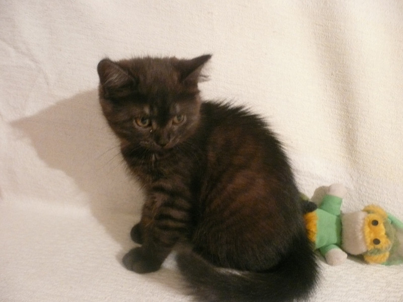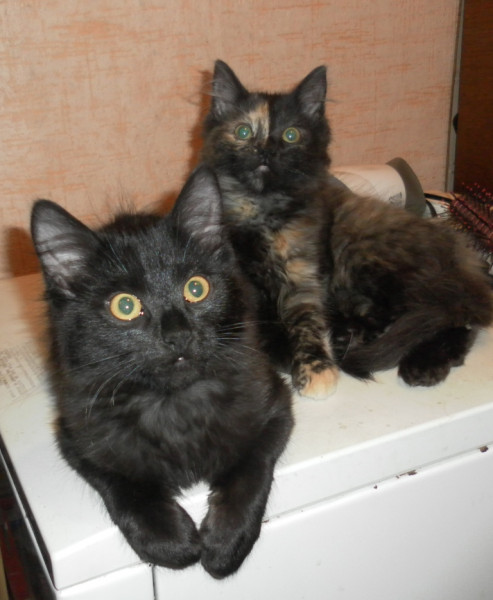 У нас есть котятки, сейчас около 2 мес. 2 девочки в основном черные, но с белыми и рыжими пятнышками.