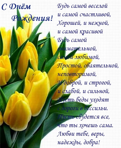 Счастья тебе много-много! Здоровья! Удачи! Любви! Успехов во всём!