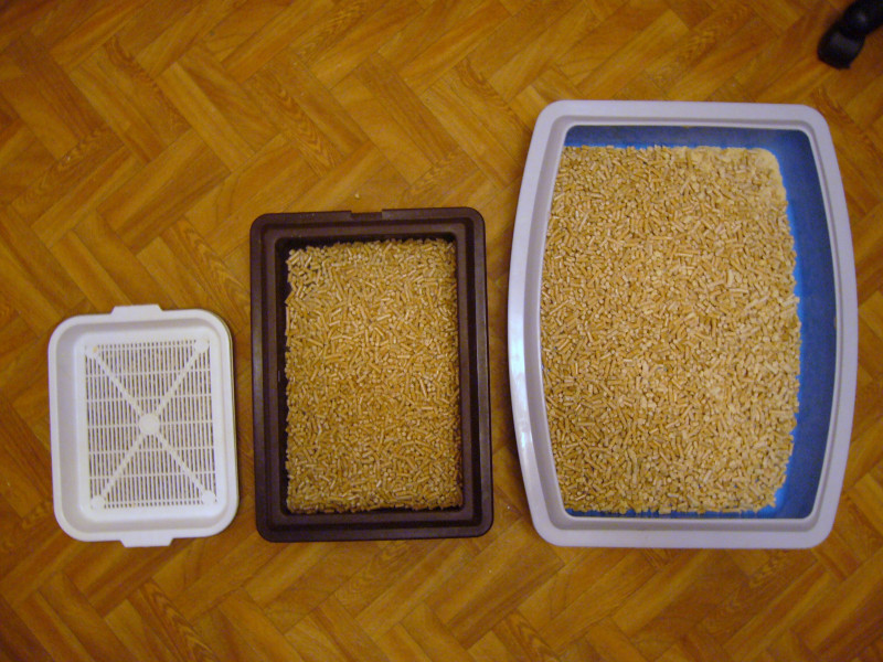 Для сравнения три туалета: обычный котячий, стандартный для наполнителя с бортиками и большой.