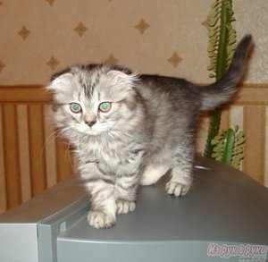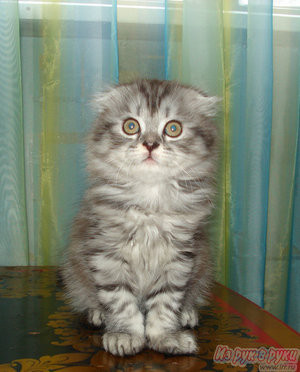 Продается вислоухий пушистый котенок хайленд-фолд, окрас серебристо-черный полосатый (табби). Первый котенок в помете, очень крупный, красивый и умненький мальчик. Возраст 2.5 месяца. Неприхотлив в еде, приучен к туалету и когтеточке. С документами, от титулованных родителей. Подарки от клуба. Цена 5 т.р.