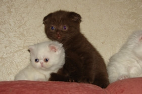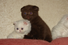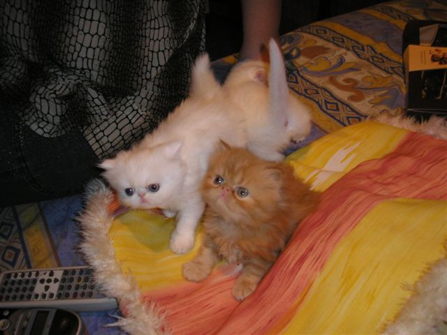 Персидская и экзотическая белоснежные девочки родились 02.02.09, отец - G.CH . CFA, W.CH . WCF, Golden G.CH . Assolux Ari-Al Joker, мать - CH. Assolux Afrodit El Zeyn. Обе генетически красные, в разведение.