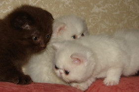 У меня уже две белых взрослых кошки - перса и экзотка. А смотрю на энти сладкие морды и боюсь, что опять себе оставлю. Хорошо ещё, что одна алиментная - т.е. владелец папы должна забрать. Мы в прошлый помёт народили троих - и алиментная кошка была оставлена в питомнике, и двое других - у меня. Посмотрите, какие были. Сейчас им полтора года. Пушистая девочка - теперь мама, а кот живёт в своё удовольствие, кастрирован.