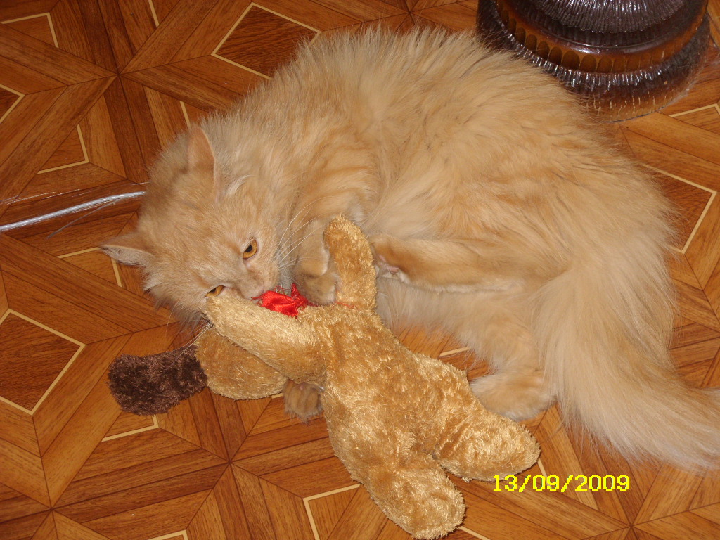 у меня кот тоже не равнодушен к мягким игрушкам. жил он две недели у родителей, так когда пришли забирать его нам еще в нагрузку дали, те игрушки которые он там погрыз. а что он сделал с бедной коровой это надо видеть конечно...