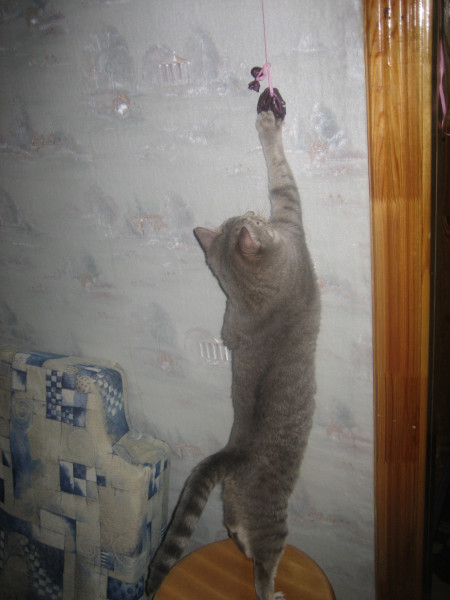 Есть указка, но эффекта ноль, не успевают они следить за ней. Лучшая игрушка это мышки, фантики и мухи. Вот тут начинаются гонки по вертикали.