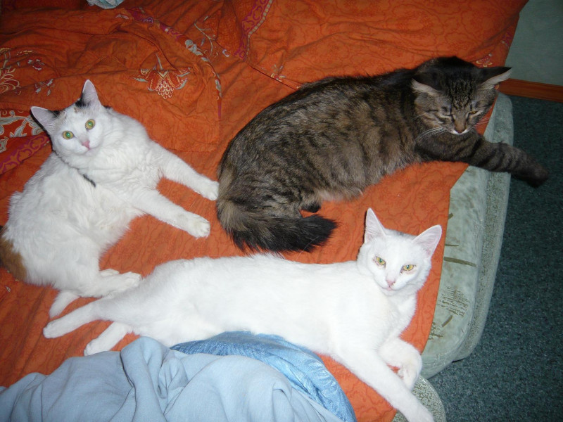 Все трое Муля, Дуся и Киса: пупсон, бестолочь, серый хвост или черный хвост, зараза, просто морда, солнышко, все трое откликаются на Морду и Бестолочь