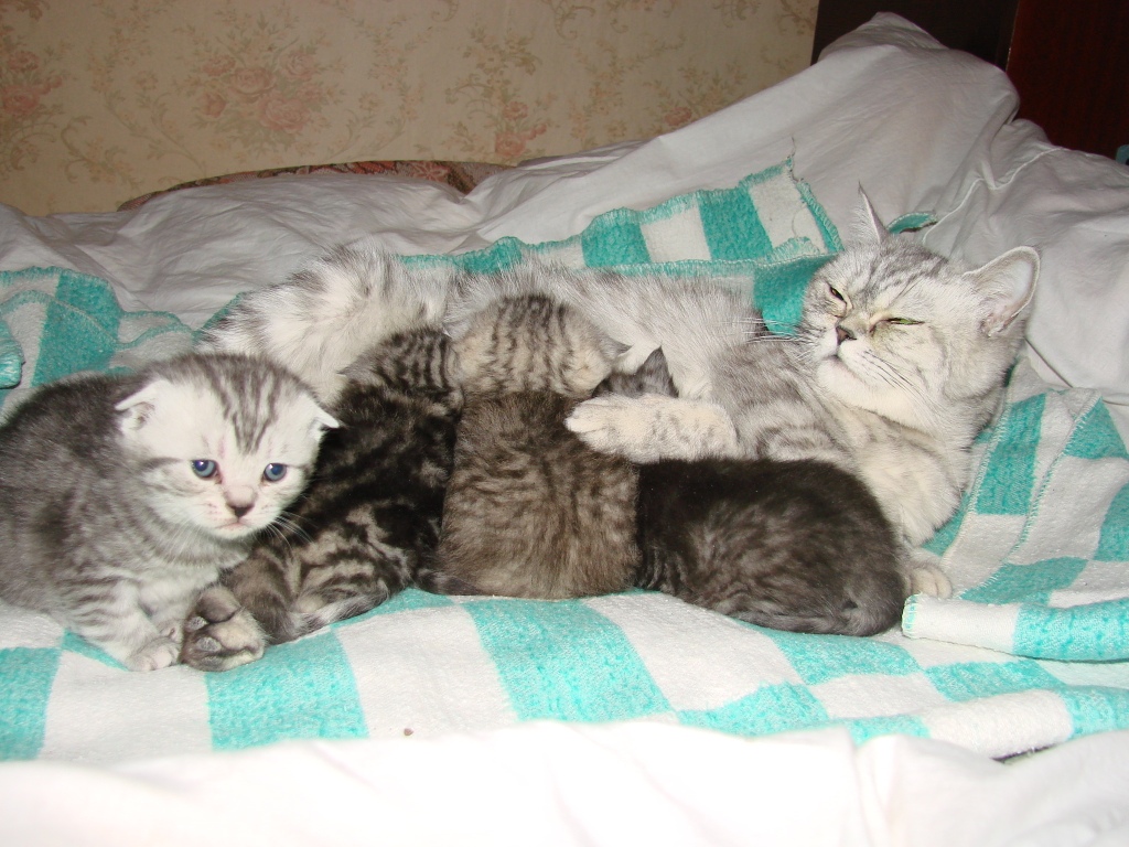 31 декабря в 6 часов утра моя Лизонька начала рожать. Первый котенок появился на свет в 9:37 девочка мраморного окраса. Родила пятирых котят пятый к сожелению был мертвый, роды вообще проходили очень тяжело. Но слава богу все позади.