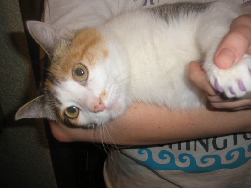 кошка трехцветная больше белого, лапа была сломана у нее и криво срослась но кошка приспособилась
