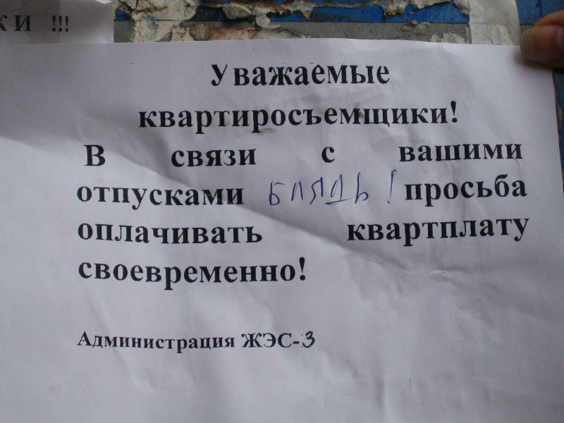 Супер!!! Я на первом этаже живу. Вешала своё объявление на подъезд: "Уважаемые..ля-ля..просим не хлопать дверью..ля-ля..Благодарим за понимание". Приписка питерская точно та же, что и у меня на уме крутилась!!! ))))))))))))))))))))))