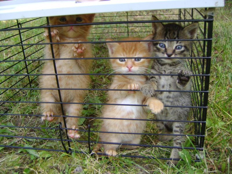 Котятам около месяца. Бросила на крыше контейнера, приходящая мама-кошка, к жизни на улице их научить теперь некому. Ухаживаю за ними недели две. Живут пока в клетке. Растут и долго их там держать нельзя. Не пугайтесь : в клетке спят и фотографировать удобнее, гуляют по чистой лужайке регулярно.
