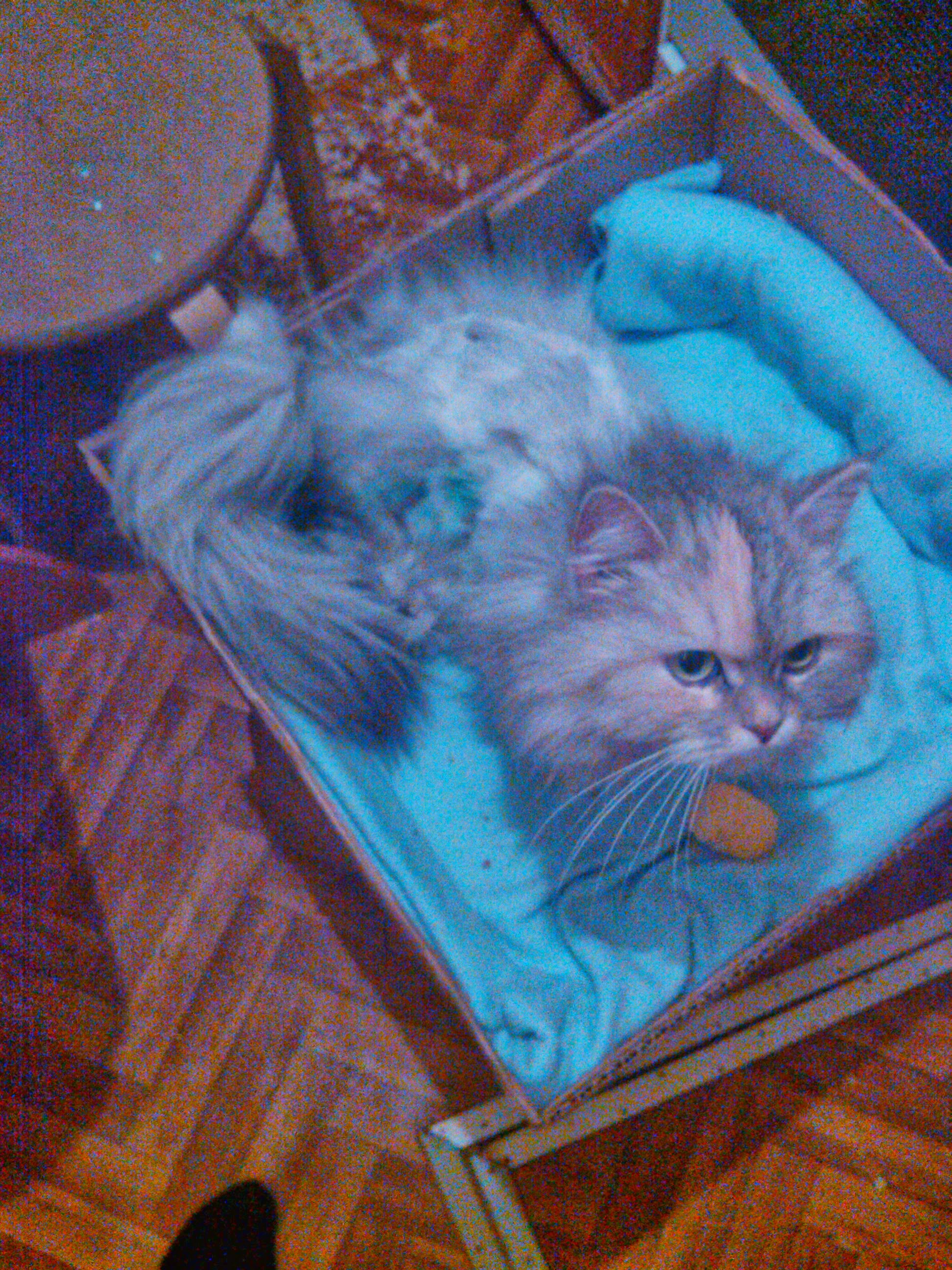 кошечка домашняя - сразу легла в приготовленную коробочку-"место",