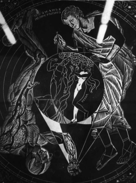 "Вчера просматривал альбом с редкими фотографиями сурового советского искусства и обратил внимание на данный опус. Можно предположить, что это очередная алхимическая иллюстрация на тему преображения несчастного советского человека. Тут мы обнаруживаем глубокий и впечатляющий символизм: