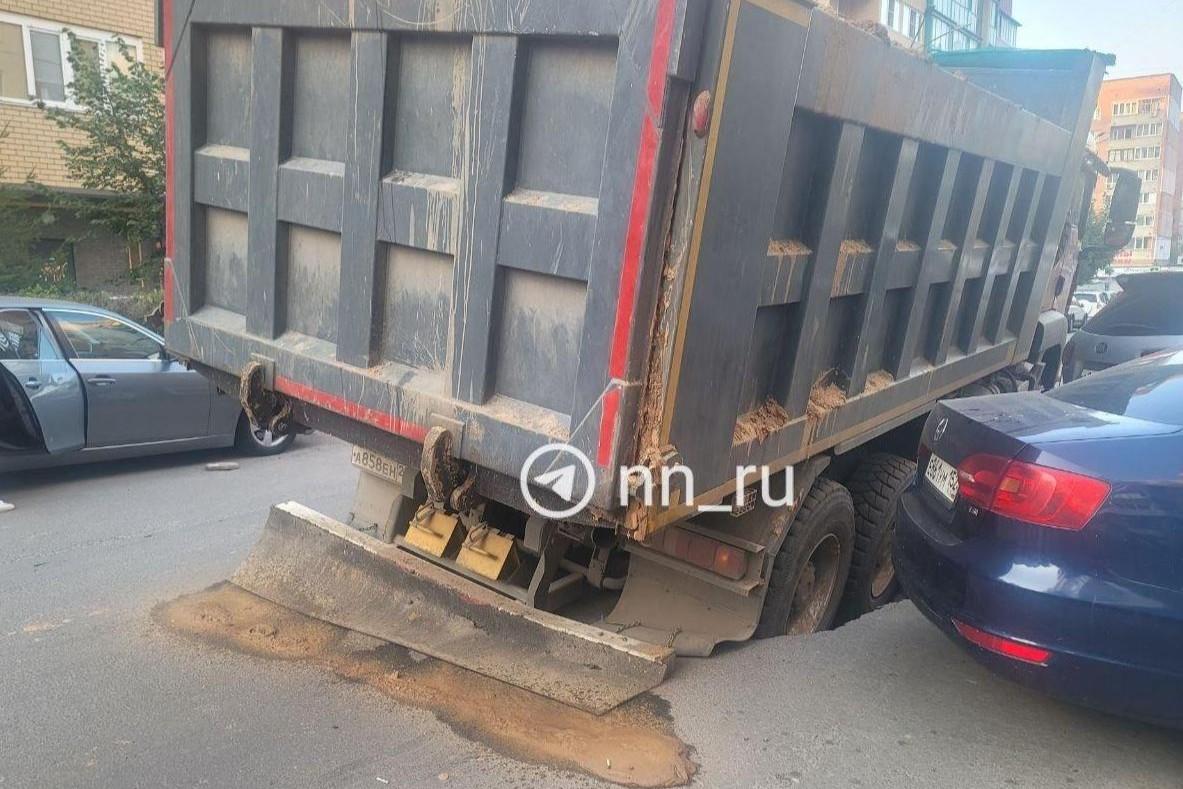 В центре Нижнего Новгорода под грузовиком провалился асфальт — фотоПод угрозой оказались припаркованные рядом иномарки